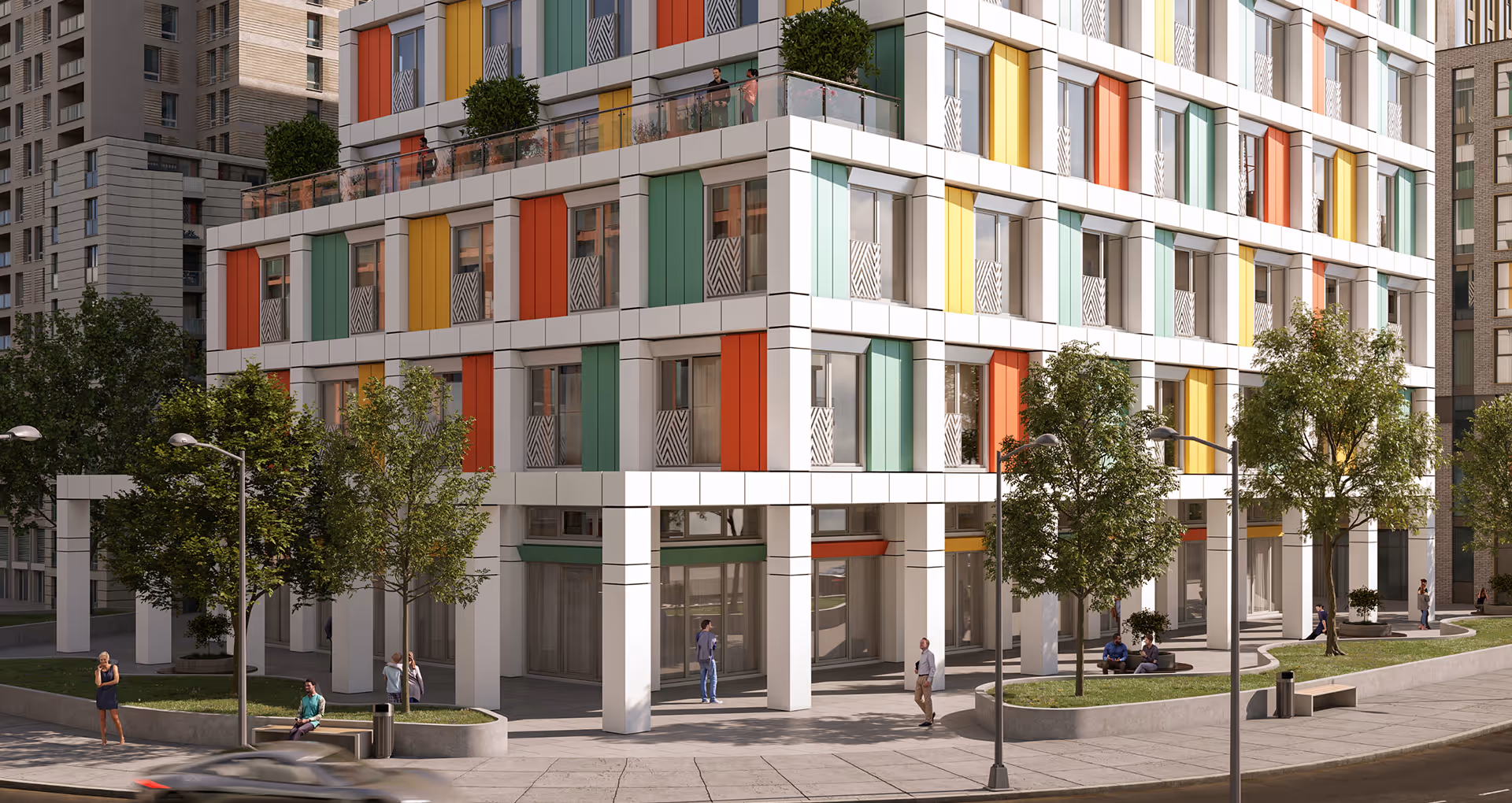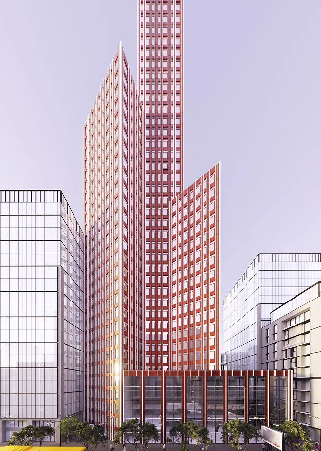 The tower experiments with cladding as an emotional driver rather than a mere exterior finish. Its three façade variations demonstrate how color alone can shift perception—turning one building into three radically different experiences.