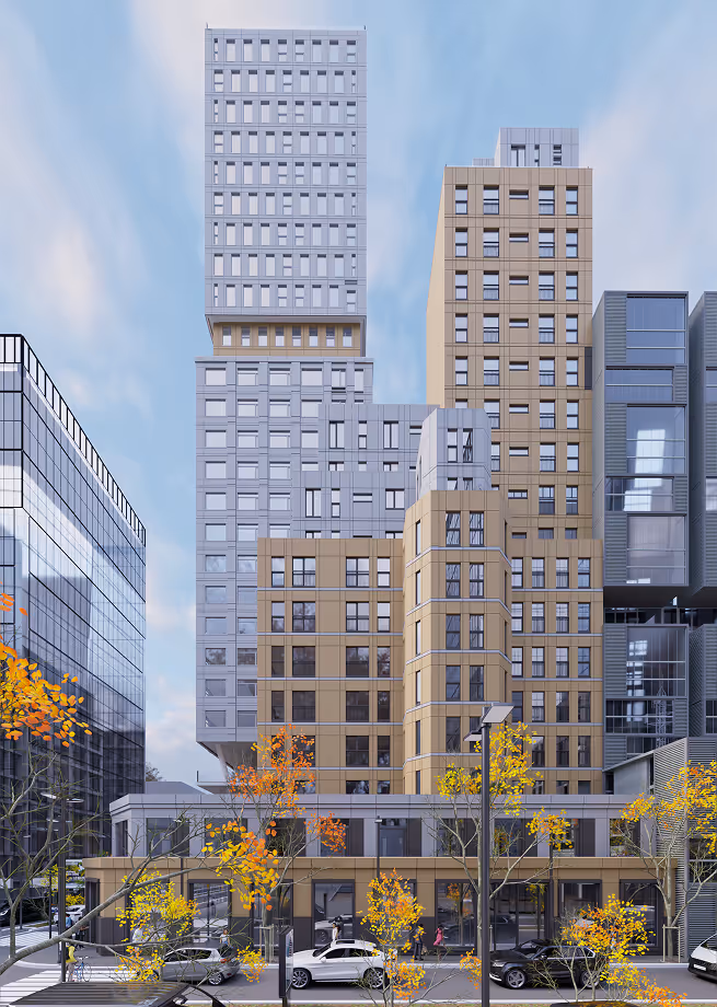 This mixed-use project explores how one building can adapt to the shifting pulse of city life. Designed with Prefab Studio and clad entirely in aluminum panels, the concept blends offices, commercial storefronts, and residential spaces into a single architectural form—each expressed through its own façade identity.