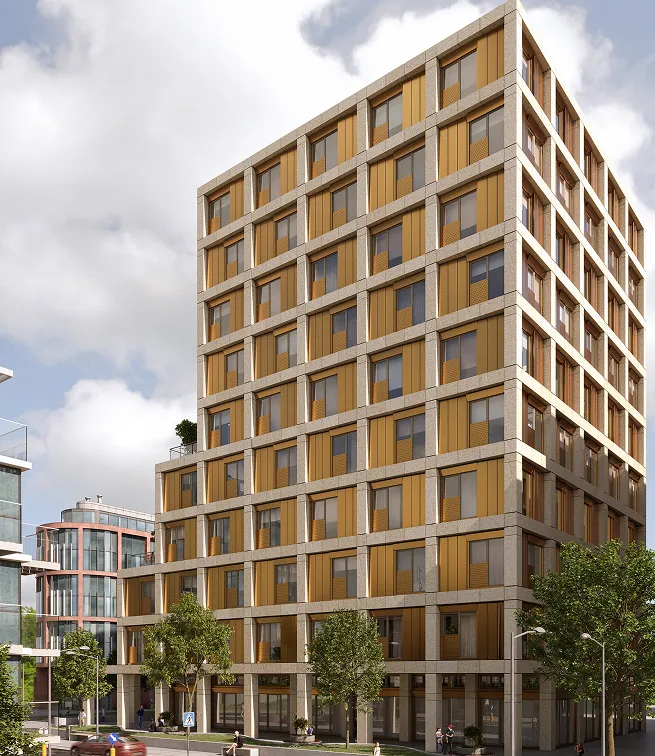 Cosentino stone paired with metallic gold-coated aluminum elevates the façade into a statement of luxury. Here, the building becomes a destination—a striking urban hotel designed to impress at first glance.