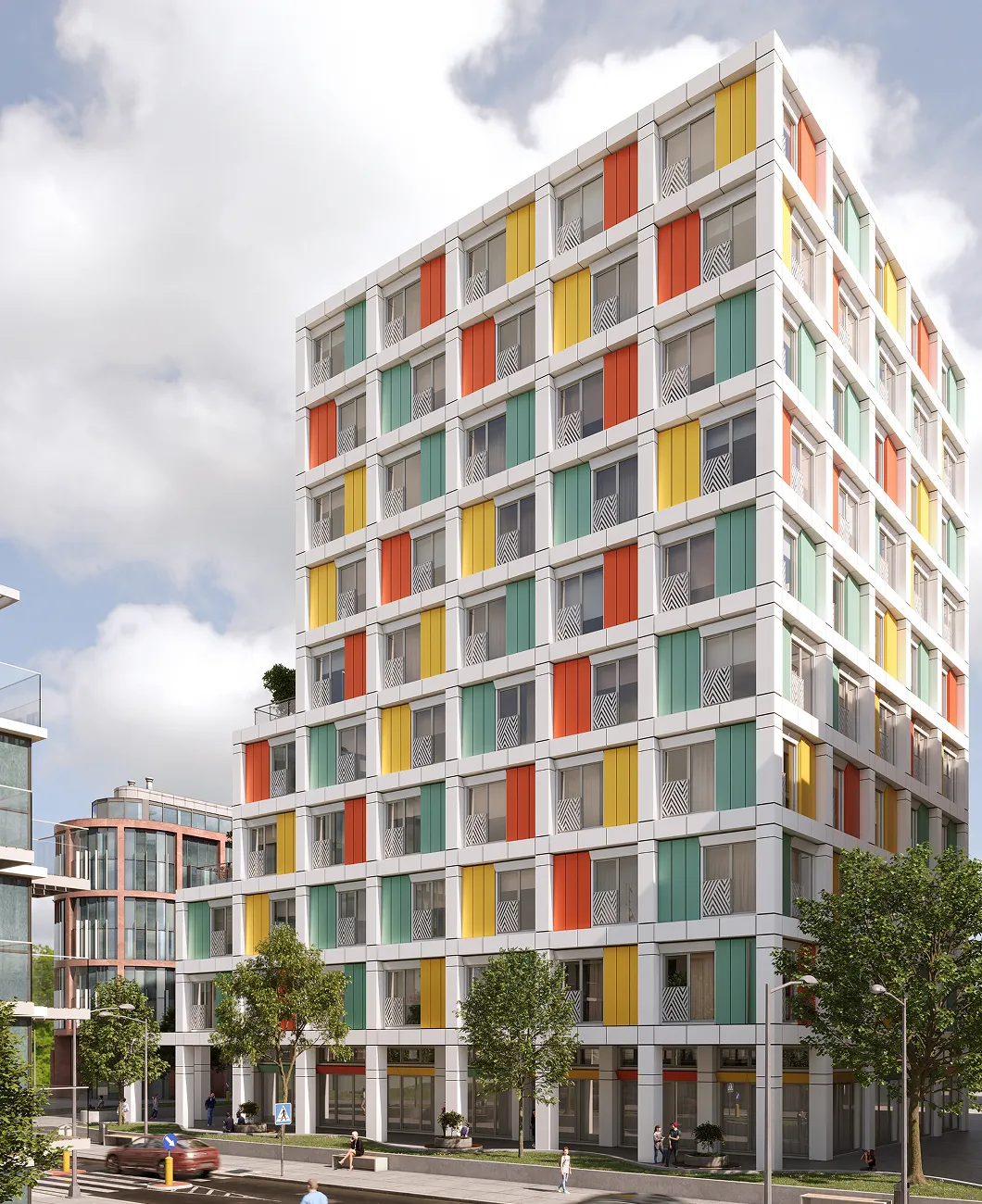 Switching to fiber cement and colored ACM transforms the same structure into a welcoming residential apartment block. The design feels modern yet approachable, showing how thoughtful panel systems can deliver comfort and community at scale.
