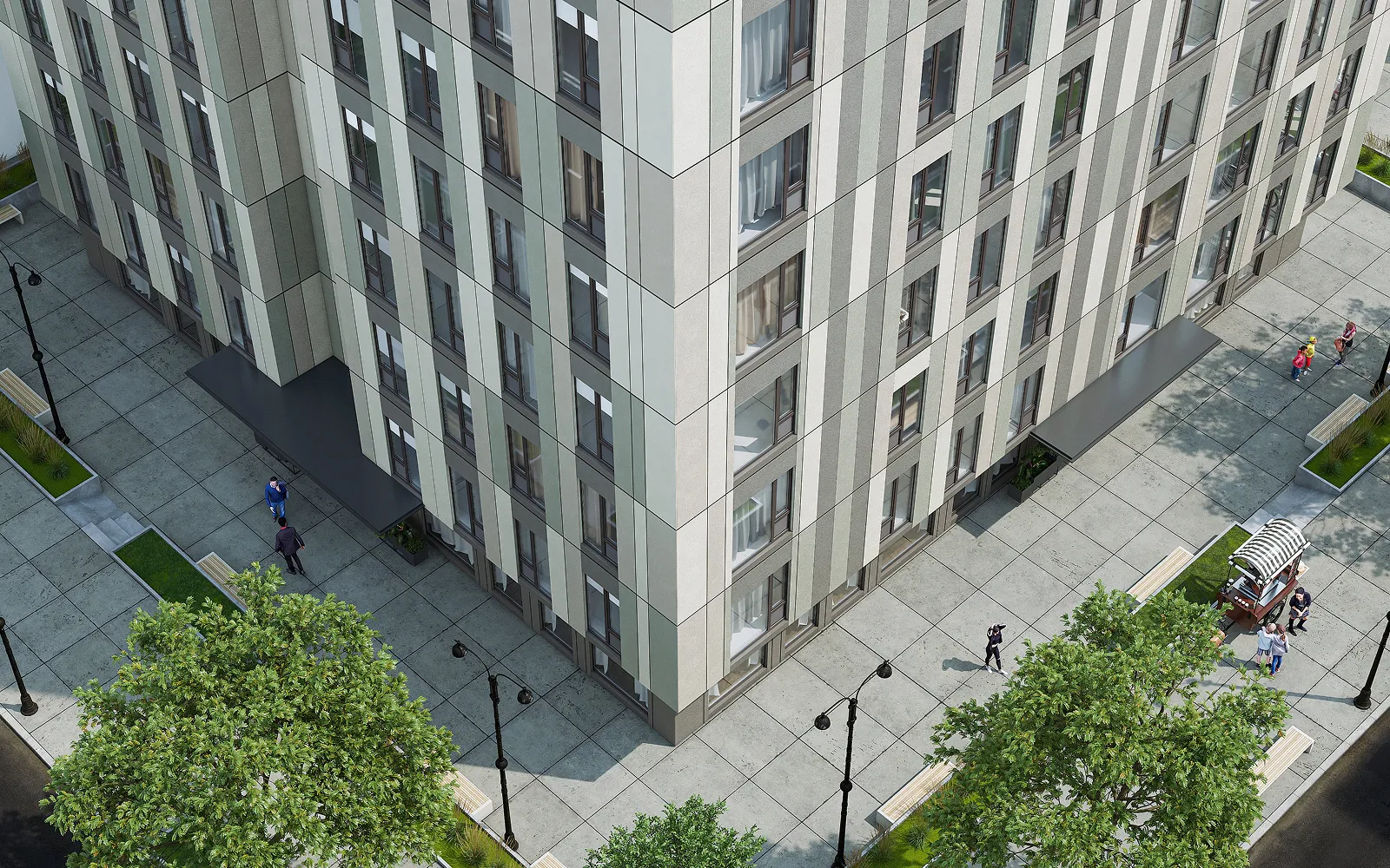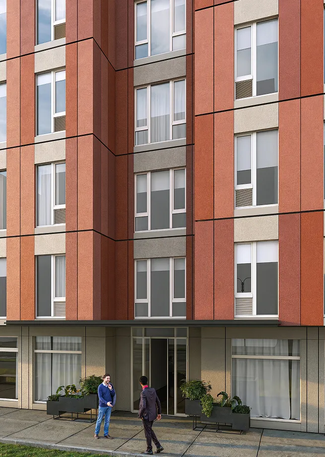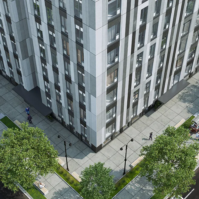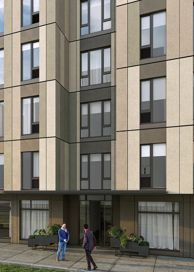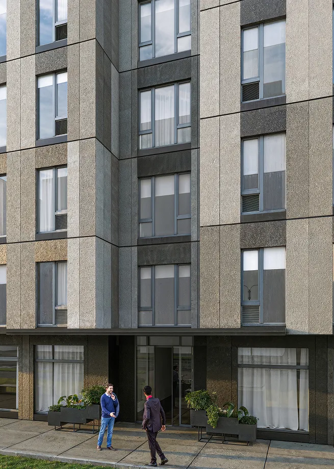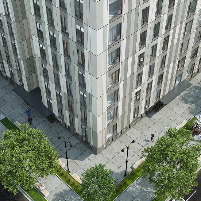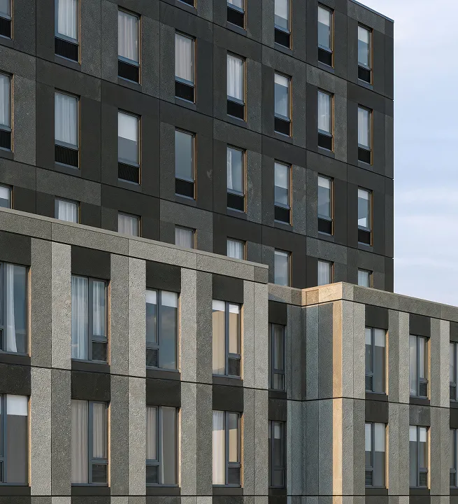 Designed for the realities of student housing budgets, this 13-story dormitory proves that architecture doesn’t need luxury materials to deliver meaningful visual impact. With fiber cement cladding as the primary material, the concept embraces practicality while still offering a dynamic and contemporary façade.